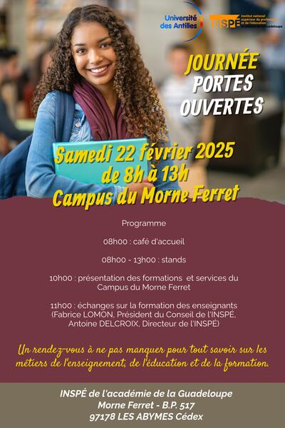 L'Institut national supérieur du professorat et de l'éducation (INSPE) de l'académie de la Guadeloupe a le plaisir de vous inviter à sa Journée Portes Ouvertes, le 22 février 2025, sur le campus du Morne Ferret (ex. IUFM de Guadeloupe).