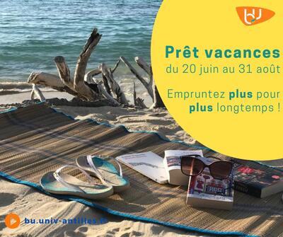 Les BU des Antilles se mettent à l'heure des vacances et vous proposent depuis le lundi 20 juin le "prêt vacances 2022". En Guadeloupe comme en Martinique, vous pouvez ainsi emprunter plus de documents (pas de limite de nombre) pour plus longtemps ! La date de retour des documents empruntés est fixée au 31 août 2022.